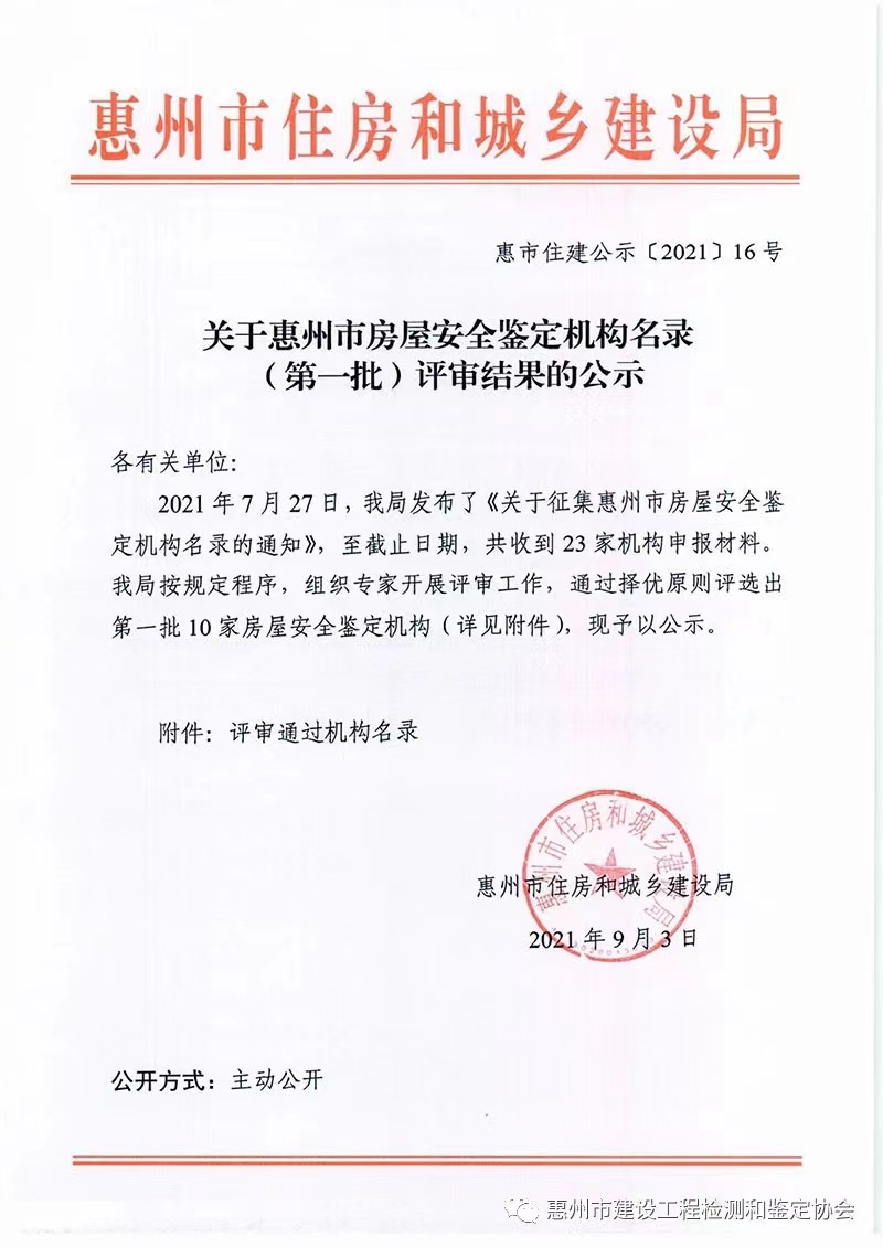 惠市住建公示【2021】16号 关于惠州市房屋安全鉴定机构名录